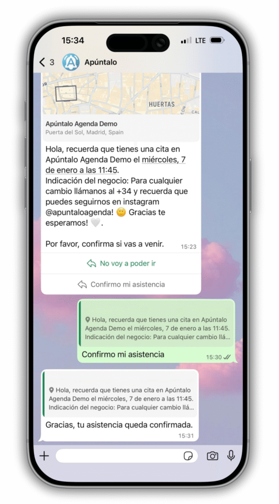 Tus clientes reciben un WhatsApp con la hora y el lugar de la cita