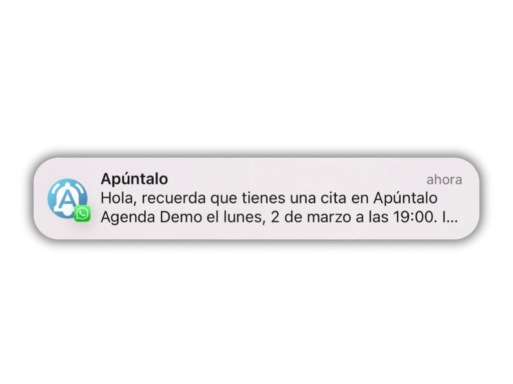 Apúntalo envía recordatorios automáticos por WhatsApp para que tus clientes tengan siempre la cita a mano y no la olviden. Tú eliges cuándo se envían y nosotros nos encargamos del resto.
